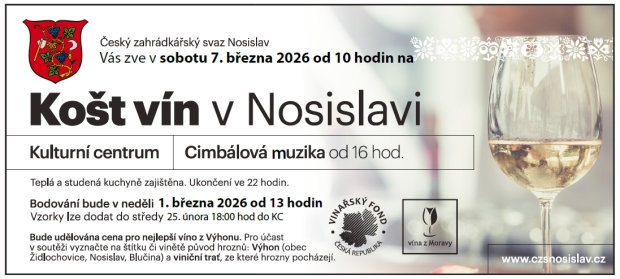 Vinaři z Nosislavi srdečně zvou všechny milovníky vína na tradiční košt vín do Nosislavi. Můžet se těšit na více než 550 vzorků vín, cimbálovou muziku a občerstvení je samozřejmě pro Vás také zajištěno.Přijďte na Košt do Nosislavi.